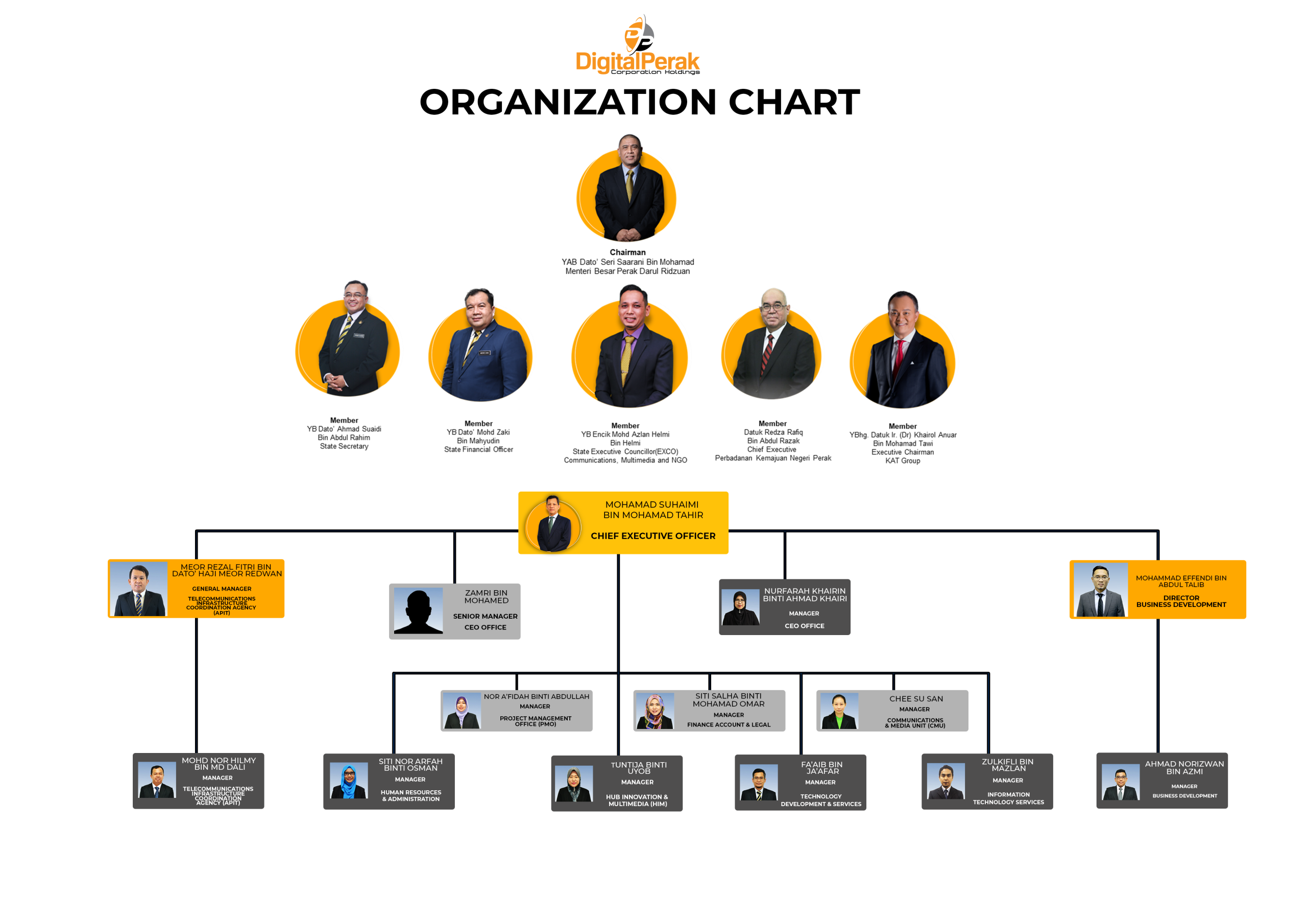 Currently helmed by Encik Mohamad Suhaimi bin Mohamad Tahir as the sixth CEO, the company is supported by a team of experienced individuals to spur on the developments of visions and directions of the State, through 4 core business units, namely: Agensi Penyelaras Infrastruktur Telekomunikasi Negeri Perak (APiT), Technology & Development Services (TDS), Hub Inovasi & Multimedia (HiM) dan Creative Multimedia Services (CMS) centred upon 4 main thrusts, which are Smart Connectivity, Smart People, Smart Economy dan Smart Government.